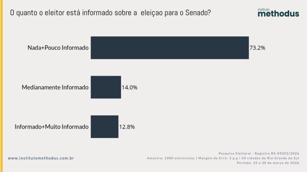 Quando questionados sobre o próprio nível de informação, cerca de 40% dos eleitores se consideram informados sobre a eleição presidencial. Esse percentual cai para menos de 20% quando o tema é o governo estadual e atinge seu ponto mais crítico no Senado, onde apenas 12,7% afirmam estar informados.