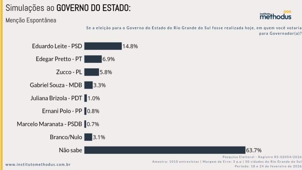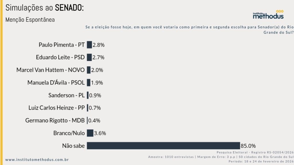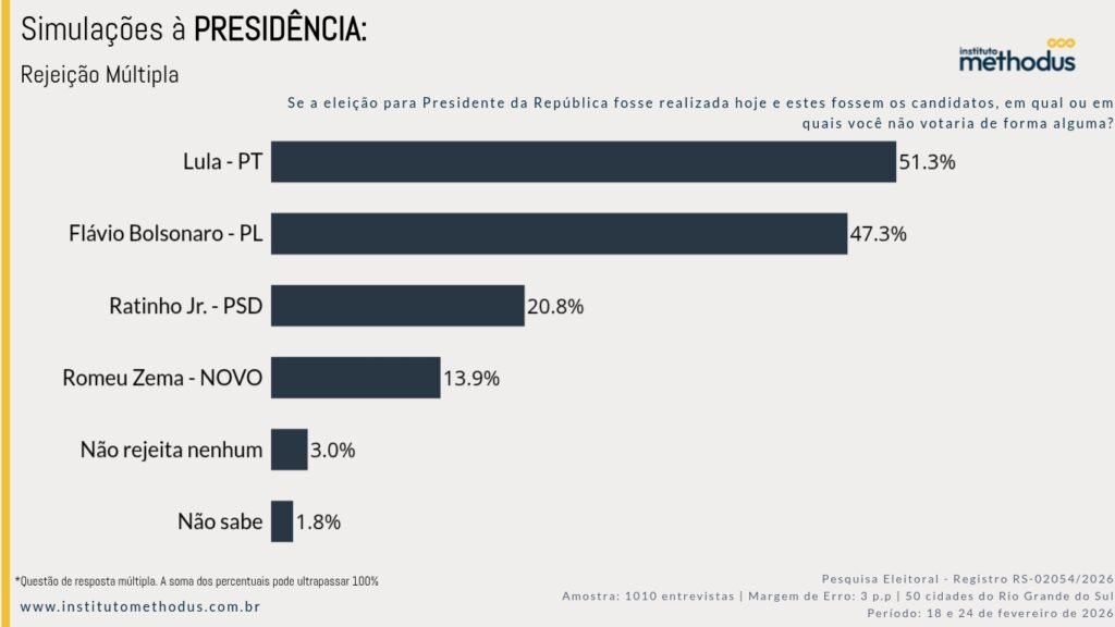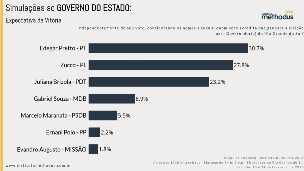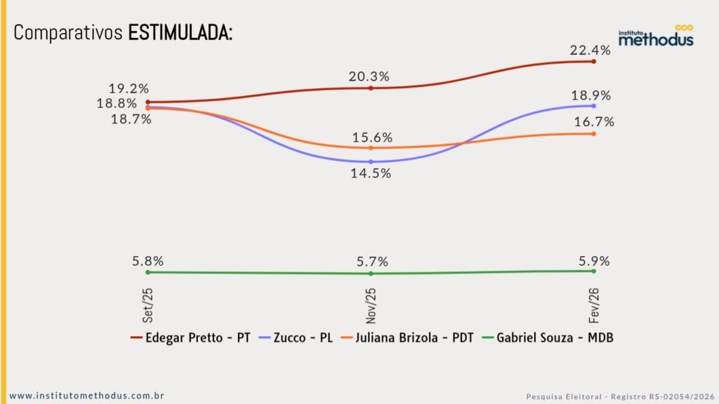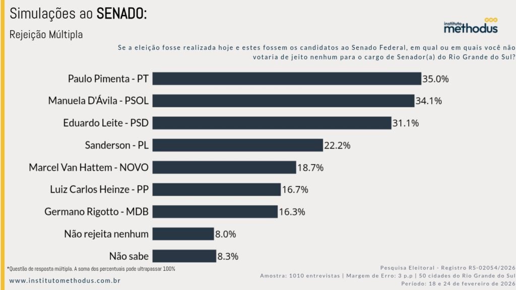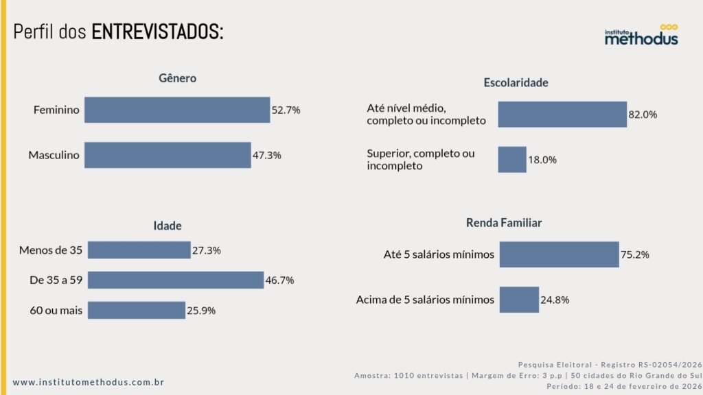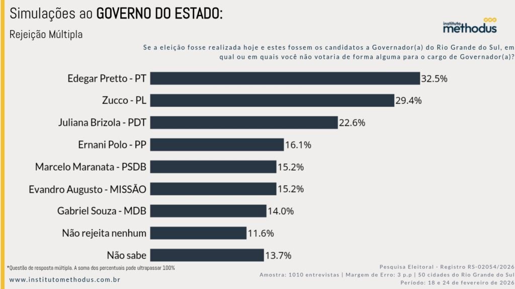 Na corrida ao Governo do Estado, observa-se liderança de Edegar Pretto (PT), com crescimento gradual ao longo das três medições. Zucco (PL) demonstra capacidade de recomposição de base, enquanto Juliana Brizola (PDT) mantém desempenho em faixa intermediária. No Senado, o cenário também é competitivo, com índices ainda em consolidação e rejeições distribuídas entre os principais postulantes, o que indica ausência de favoritismo consolidado neste momento.